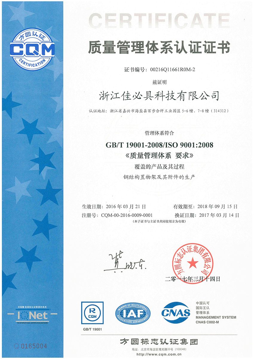 公司歷經(jīng)二十余年不斷開拓進取,在貨架及倉儲物流設(shè)備和塔內(nèi)件裝備領(lǐng)域建立了獨特的競爭優(yōu)勢,在業(yè)界樹立了良好的聲譽,并擁有“HOMUST佳必具”和“中達智能倉儲”兩大自主品牌。公司通過了質(zhì)量、環(huán)境、職業(yè)健康安全管理體系認證,以及歐盟CE、美國NSF、FSC、BSCI、SMETA、SEDEX和FCCA等認證。