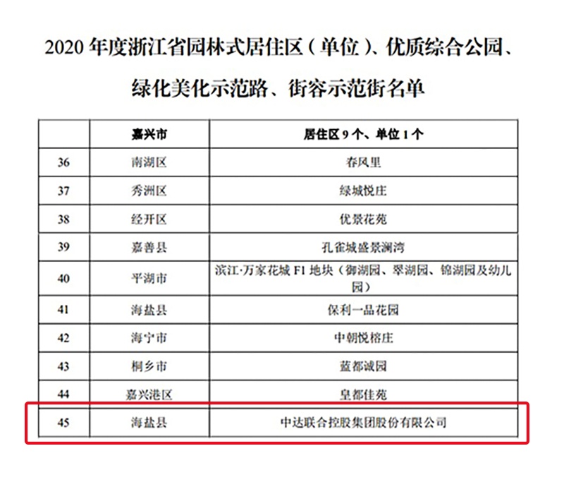 喜訊 | 中達(dá)集團(tuán)榮獲2020 年度浙江省園林式單位