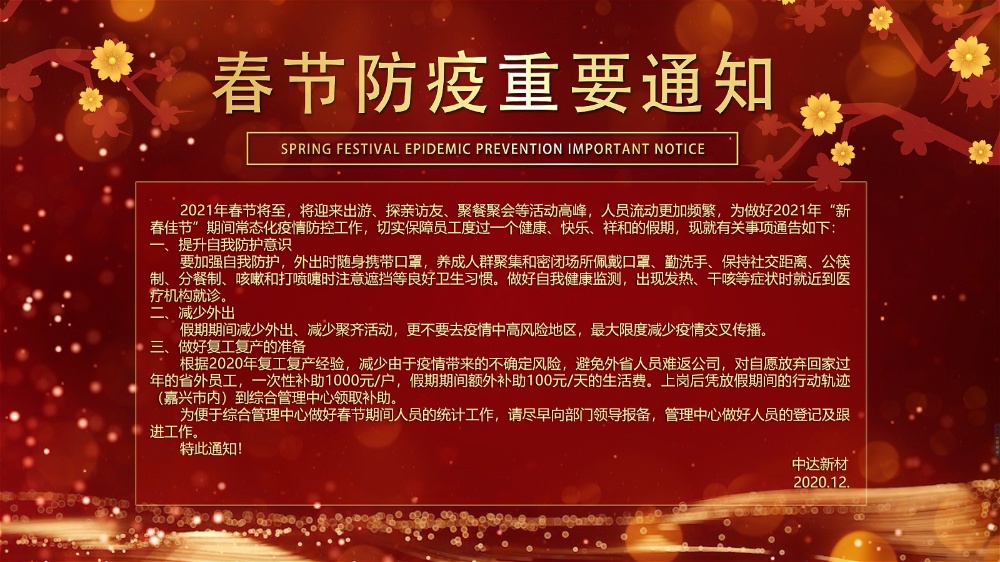 早在2020年的12月中旬,中達(dá)新材就發(fā)布了一條特別的通告:關(guān)于做好春節(jié)期間疫情防控工作的通告——公司將對自愿放棄回老家過年的省外員工,一次性補(bǔ)助1000元/戶,假期期間額外補(bǔ)助100元/天的生活費(fèi),員工可在返崗后憑放假期間的行動(dòng)軌跡(嘉興市內(nèi))到綜合管理中心領(lǐng)取補(bǔ)助。