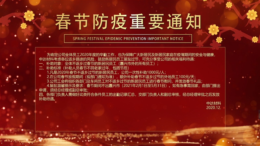 與此同時(shí),中達(dá)材料也積極響應(yīng),為肯定公司全體員工2020年度的辛勤工作,考慮到春節(jié)期間新冠疫情形勢依然嚴(yán)峻,所以為了廣大新居民及其家庭的安全和健康,中達(dá)材料鼓勵(lì)新居民員工留鹽過節(jié),充分享受公司的福利待遇。