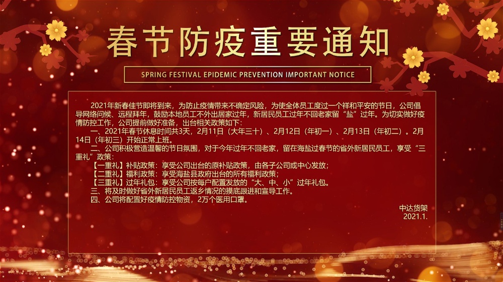 隨后,中達(dá)貨架也有序安排好了相關(guān)疫情防控工作,倡導(dǎo)員工們網(wǎng)絡(luò)問候、遠(yuǎn)程拜年,鼓勵(lì)本地員工不外出居家過年、新居民員工留“鹽”過年,除此之外中達(dá)貨架還為大家精心準(zhǔn)備了“三重禮”政策。