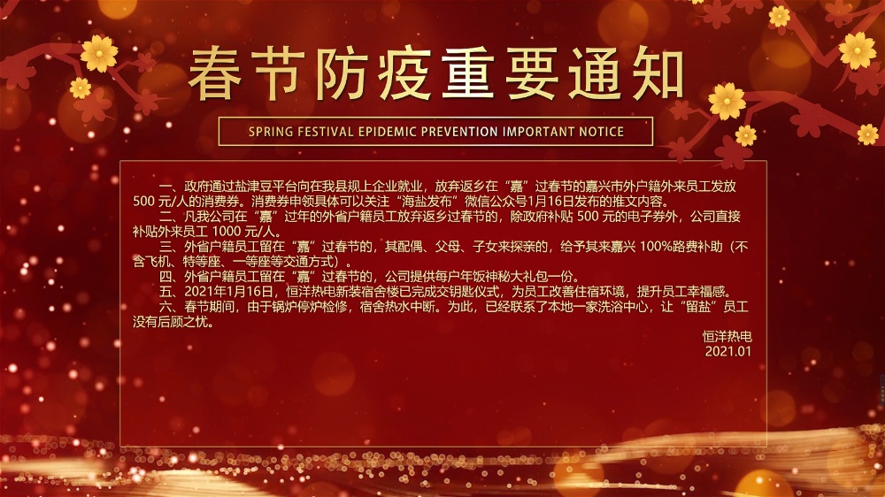 為降低疫情傳播風(fēng)險(xiǎn),恒洋熱電積極響應(yīng)政府號(hào)召,為保障廣大恒洋員工的身體健康,留外來員工在“嘉”過年,采取了多項(xiàng)暖心舉措,讓大家在海鹽過一個(gè)安心年。據(jù)統(tǒng)計(jì),今年恒洋熱電的大部分外來員工都確定留在海鹽過年了。在這里,衷心地祝愿大家在海鹽過一個(gè)開心年、放心年!