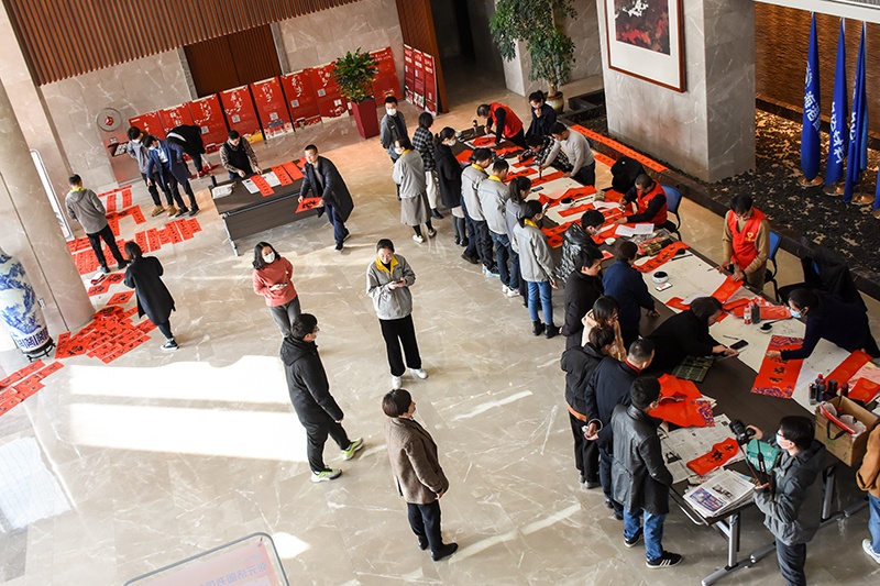 貼春聯(lián)的習(xí)俗一直延續(xù)至今,集團(tuán)工會(huì)和張?jiān)獫?jì)圖書(shū)館的本次活動(dòng),結(jié)合了“春節(jié)民俗文化”專(zhuān)題展覽,讓中華民族的優(yōu)秀傳統(tǒng)文化在企業(yè)中流傳?;顒?dòng)現(xiàn)場(chǎng)歡聲笑語(yǔ),充滿(mǎn)了喜慶的節(jié)日氣氛,隨著倒墨、鋪紙、潤(rùn)筆等準(zhǔn)備工作就緒,書(shū)法家們飽蘸濃墨,盡情揮毫,一停一頓、一起一落間,一幅幅充滿(mǎn)喜慶、吉祥、祝福、歡樂(lè)的春聯(lián)和福字在他們的筆下誕生,將春聯(lián)、福字送到員工手中。