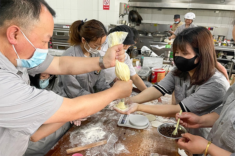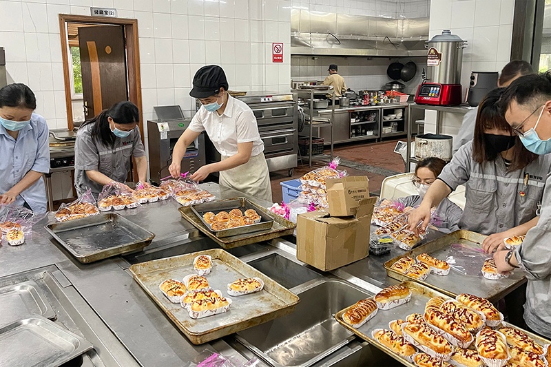 5月12日清晨,工作人員就開始做面包、雪媚娘、水果拼盤等等,恒洋熱電總工屠國華更是化身“奶油小生”,專職從事“需要力量的擠奶油”工作。園藝社的社員們也早早來到活動(dòng)現(xiàn)場(chǎng),準(zhǔn)備精致可愛的花籃。