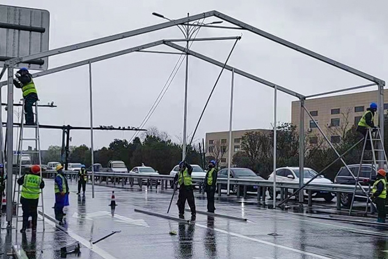 次日早6點,各分支小組迅速配備人力物力,火速前往各防疫卡點進行搭建工作。天氣持續(xù)降雨,大大增加了作業(yè)難度,但阻擋不了中達建設完成這項艱巨任務的決心,全體作業(yè)人員堅持冒雨工作,和時間賽跑!