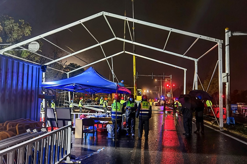 在施工現(xiàn)場,中達建設協(xié)調(diào)各方及時配齊雨衣、安全帽和反光背心等物資,盡量確??c搭建作業(yè)人員的安全防護工作。經(jīng)過一天的緊張冒雨作業(yè),4個防疫卡點的搭建工作陸續(xù)完成。
