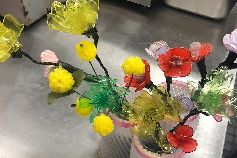②飲料瓶、方便袋、細鐵絲和膠帶等——插花擺件