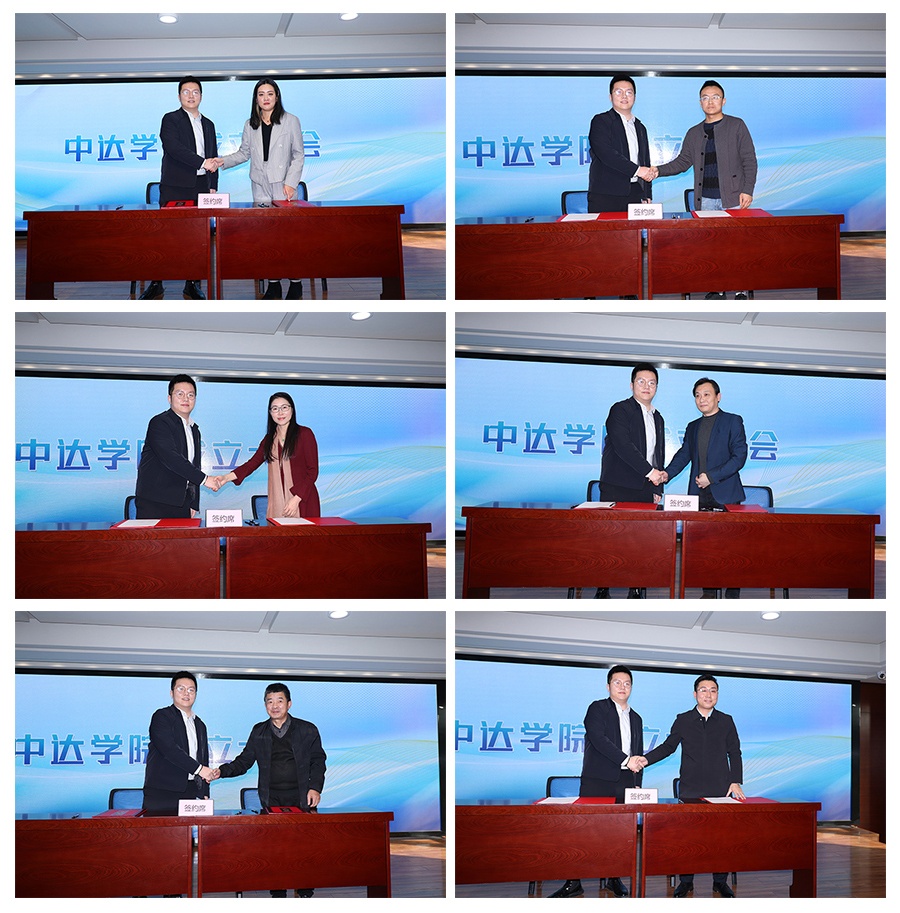 浙江大學(xué)國(guó)際聯(lián)合商學(xué)院、嘉興學(xué)院、嘉興南湖學(xué)院、海鹽縣理工學(xué)校、浙江廣播電視大學(xué)海鹽學(xué)院、派利靈犀學(xué)院的代表分別與中達(dá)聯(lián)合控股集團(tuán)簽訂合作協(xié)議。