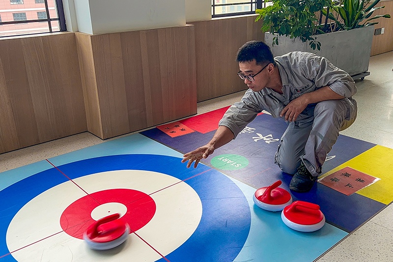 中午,社員們陸陸續(xù)續(xù)來到活動現(xiàn)場進行分組,參與本次活動的20余人共分成三組,進行3項比拼。第一項游戲是乒乓球顛球,帶球來回跑接力賽,各社員都緊張地盯著球防止球掉落,有快跑的,有穩(wěn)走的,各種方式無不體現(xiàn)了大家的獨門技巧。第二項游戲是扔沙包,大家需要將沙包拋成拋物線,輕輕落在板上才能進洞。第三項游戲是旱地冰壺,大家對該項游戲都有著濃厚的興趣,紛紛提前嘗試,而在比賽中,有些社員還是由于緊張沒有把控好力度,但也玩得不亦樂乎。