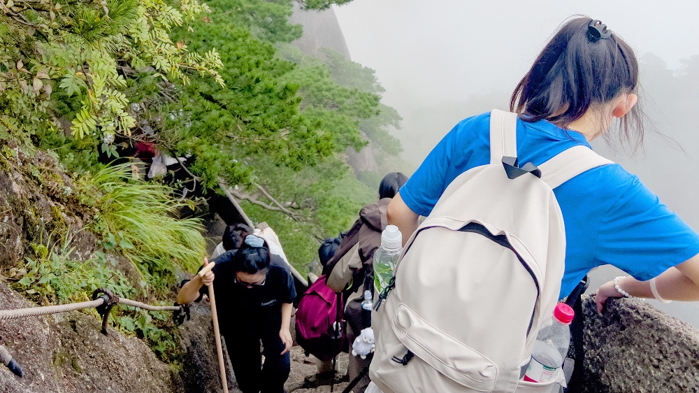 登山途中,大家都緊跟步伐、團結(jié)協(xié)作,有的幫他人分擔(dān)行李、有的互相攙扶、有的負責(zé)尋找路線、有的加油打氣。明確的分工與默契的配合讓閃耀青年們共同翻過了“如入畫境,似幻而真”的始信峰,看到了形象的猴子觀海,也感受了被云海環(huán)繞的坐擁奇峰奇石的西海大峽谷;跨過重重阻礙,大部隊登上了第一天的目的地——光明頂。
