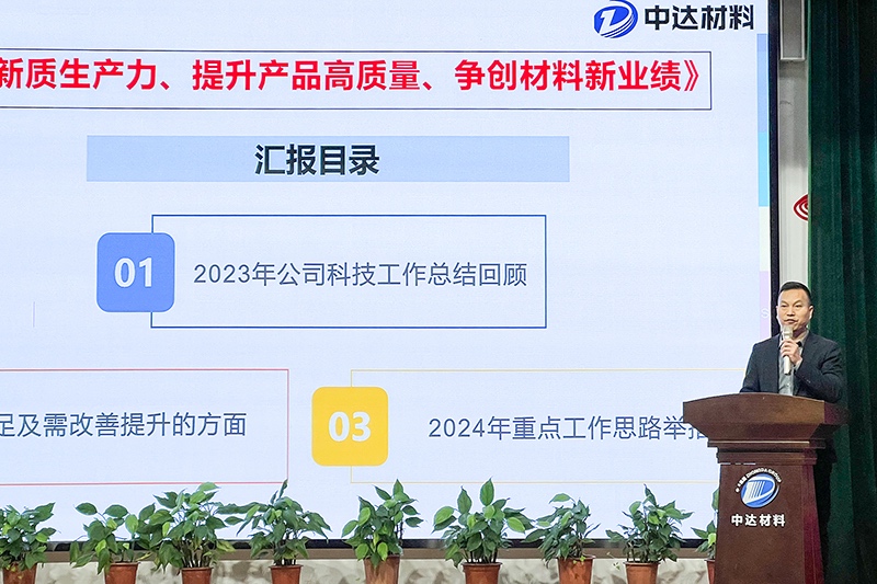 會上,中達材料副總經(jīng)理夏亞金對2023年科技工作進行總結(jié),并提出2024年工作思路與計劃。公司科技工作以重點項目、重點技術(shù)突破為主要方向,重抓內(nèi)部生產(chǎn)管理,以一貫制技術(shù)質(zhì)量管理為抓手,突出抓好“生產(chǎn)工藝創(chuàng)新”和“品質(zhì)提質(zhì)創(chuàng)新”兩大項目。以技術(shù)創(chuàng)新為引領(lǐng)推動技改創(chuàng)新、發(fā)明創(chuàng)新、管理創(chuàng)新深入開展,加快推進技術(shù)創(chuàng)新和數(shù)字化建設(shè)力度,促進生產(chǎn)制造高端化、智能化、綠色化發(fā)展,助力中達材料節(jié)能降本和提質(zhì)增效有明顯提升。