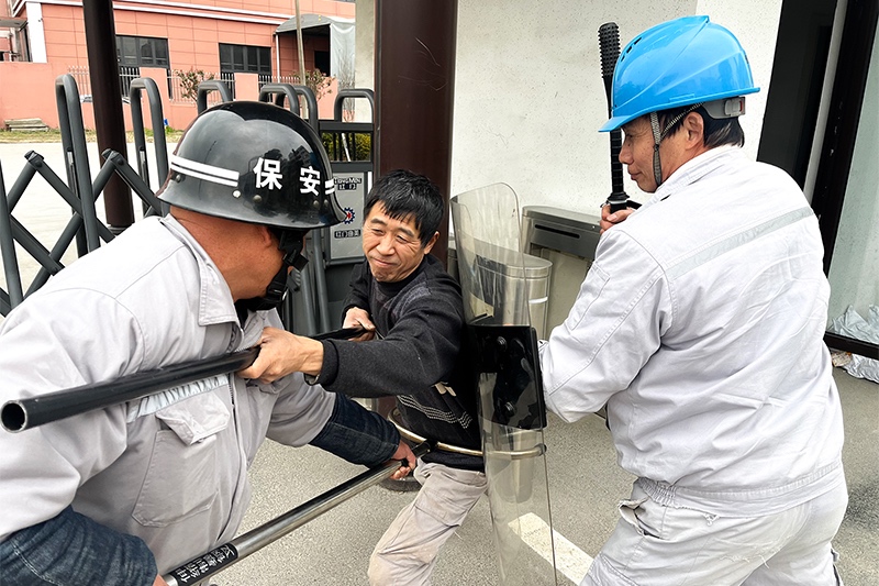 隨后,演練正式開始。由一名檢修班員工扮演“可疑人員”,試圖強行闖入廠區(qū),應(yīng)急預案立即啟動。值班保安員馬上穿戴好防暴工具,手持防爆盾、鋼叉等器械,迅速趕赴現(xiàn)場。在大家的默契配合下,安保人員成功將“歹徒”合圍至門衛(wèi)室護欄上,并最終將其制服。